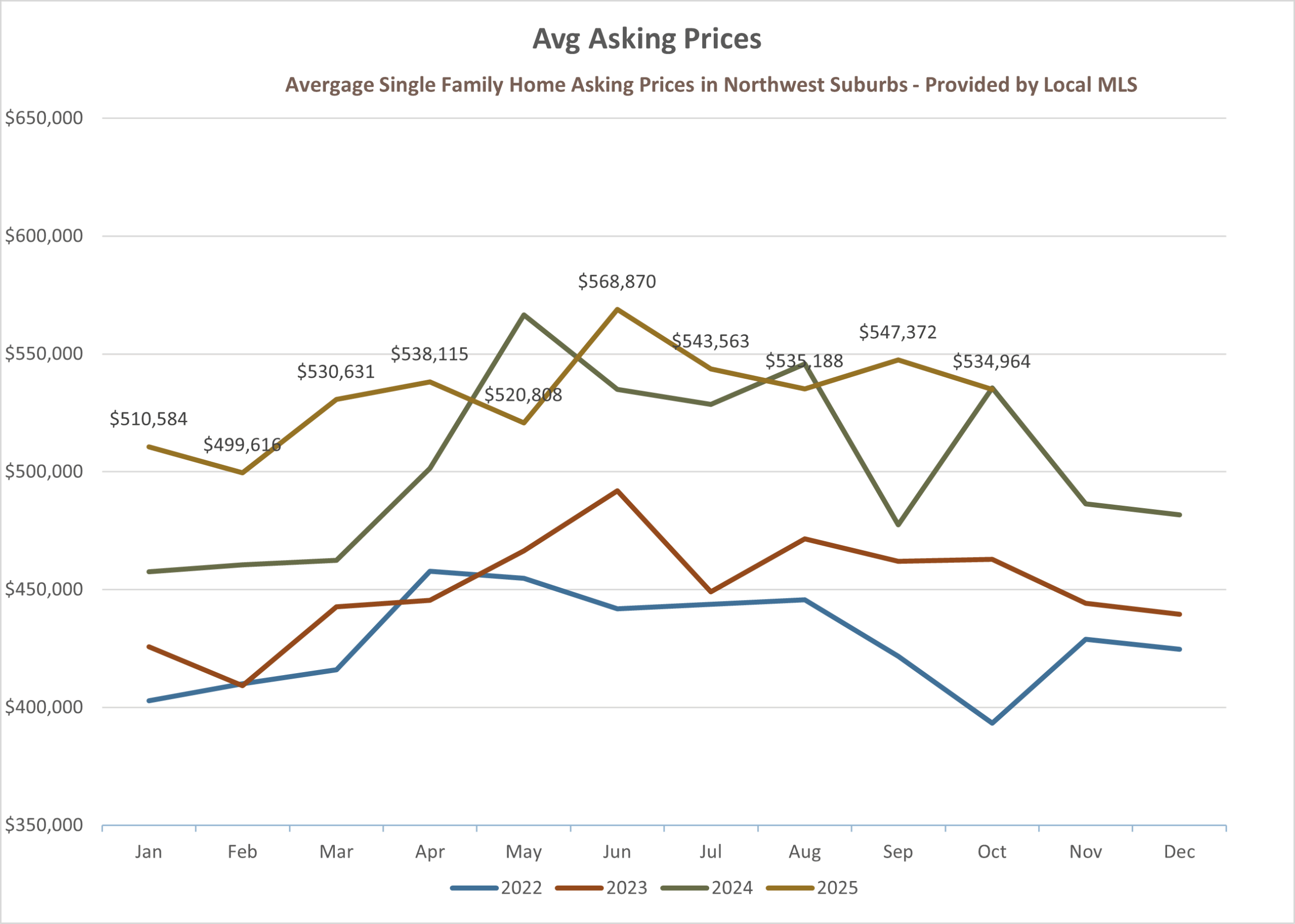 In October 2025, homes were listed around $534,964 on average — just slightly above the final sale values.