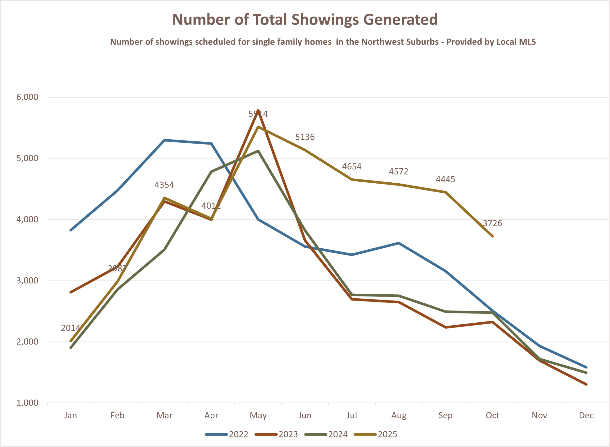In October 2025, there were about 3,700 total showings, averaging 6–7 showings per listing.